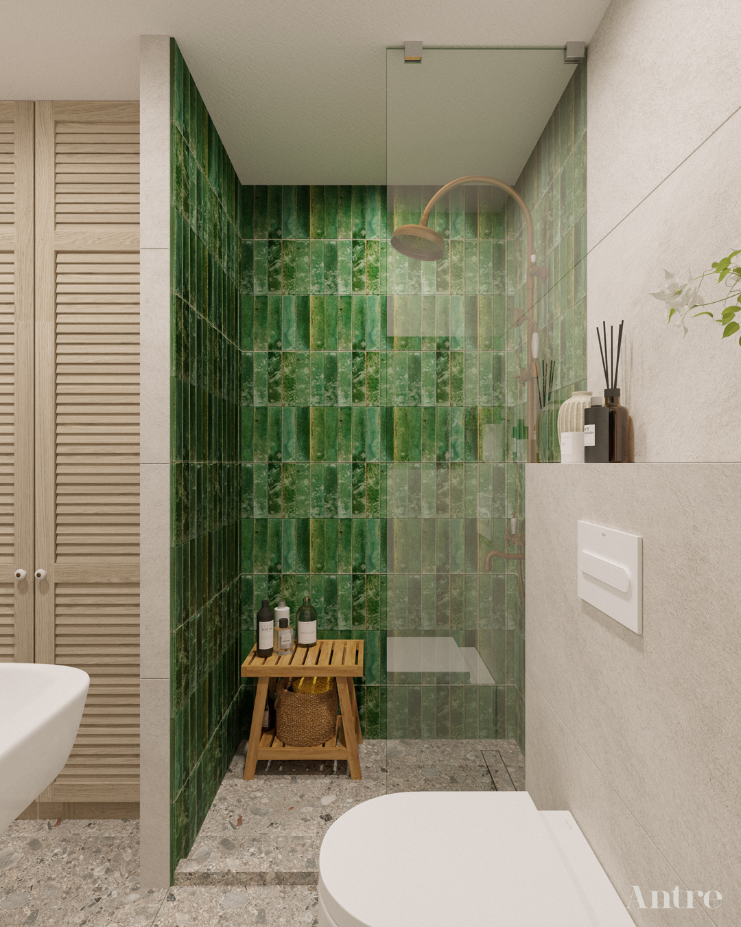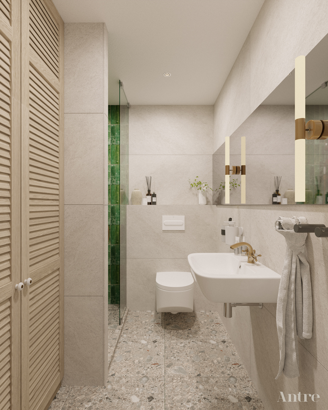 The bathroom continues the narrative of organic luxury, featuring a stunning emerald-green tiled walk-in shower that evokes a sense of botanical tranquility. Terrazzo flooring anchors the room with its playful yet sophisticated pattern, perfectly complementing the minimalist floating vanity and brushed gold fixtures. Throughout the entire apartment, the lighting design is meticulously planned, utilizing sleek white track lighting and sculptural wall sconces to create layers of ambiance. This project successfully demonstrates how a limited square footage can be transformed into a grand, multifunctional sanctuary through the intelligent application of texture, reflective surfaces, and bespoke architectural details.