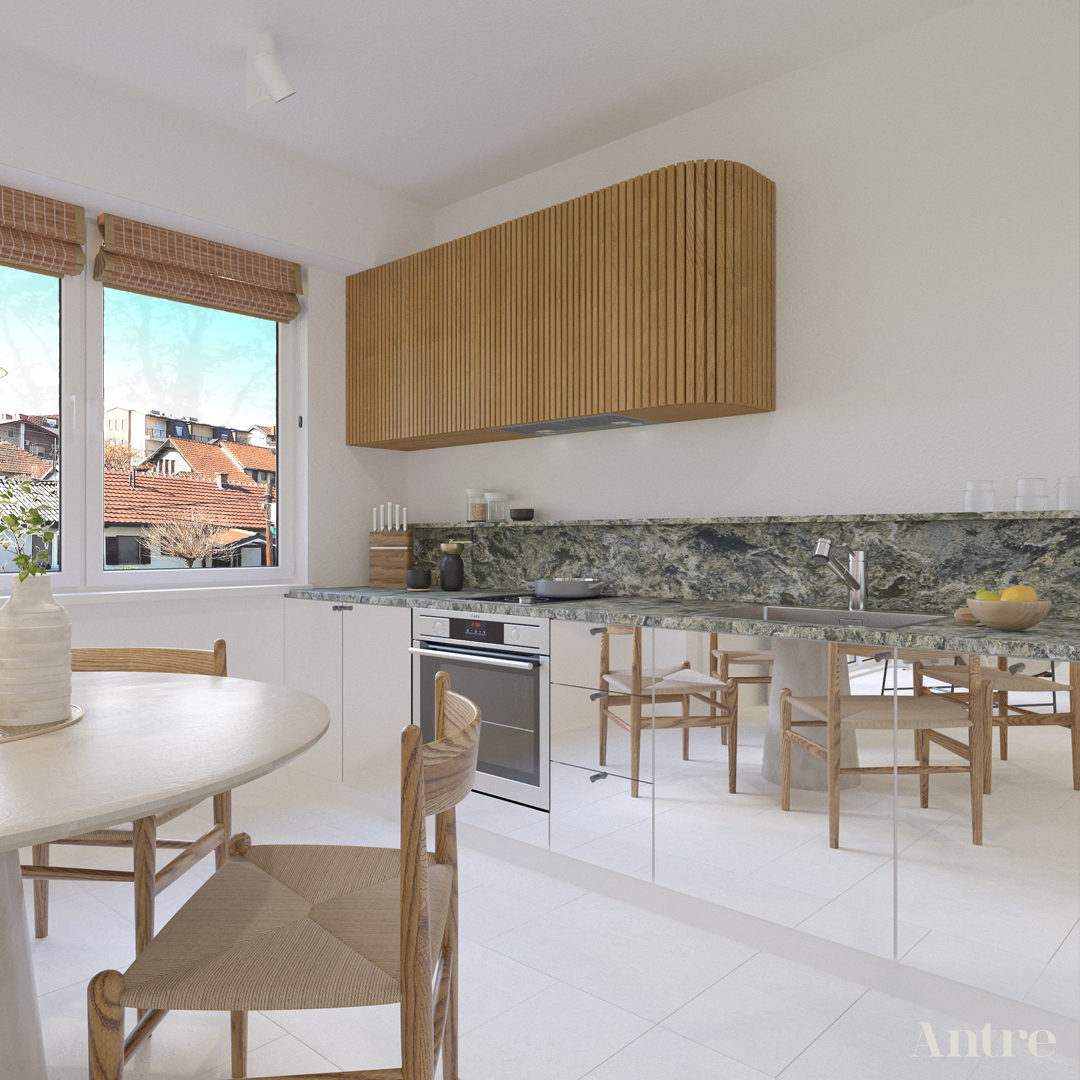 In the heart of the home, the kitchen stands as a testament to sophisticated material selection. A striking forest-green marble countertop and matching backsplash provide a bold, organic contrast to the pristine white cabinetry. The upper storage features a unique slatted timber facade, introducing a rhythmic verticality that echoes throughout the space. Below, mirrored base cabinets create an ingenious illusion of infinite floor space, reflecting the iconic mid-century modern seating and the circular stone dining table. Every element, from the woven window blinds to the brass accents, is chosen to enhance the tactile experience of the home.