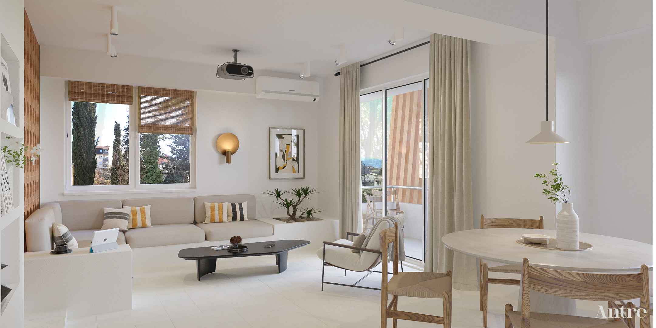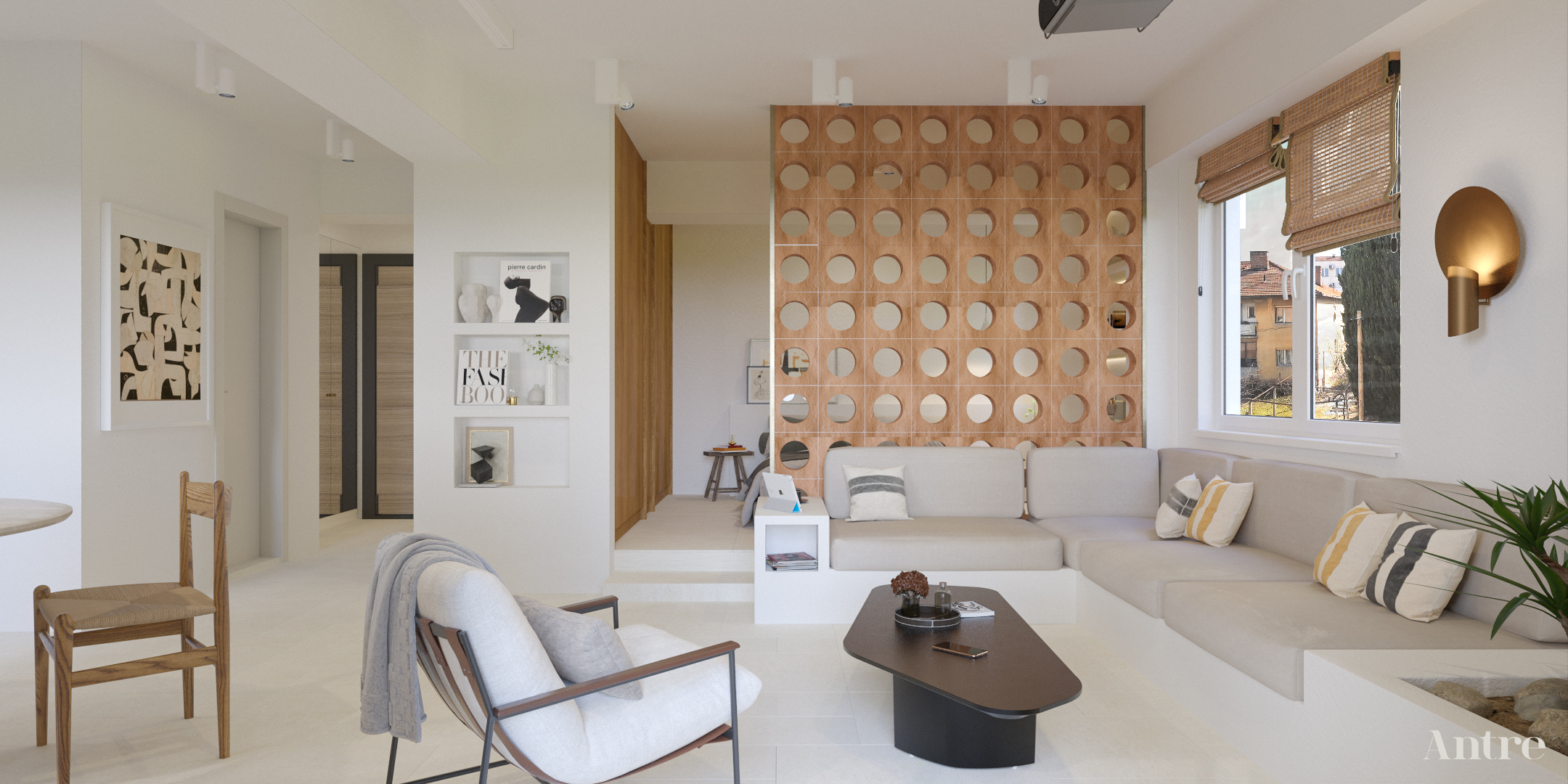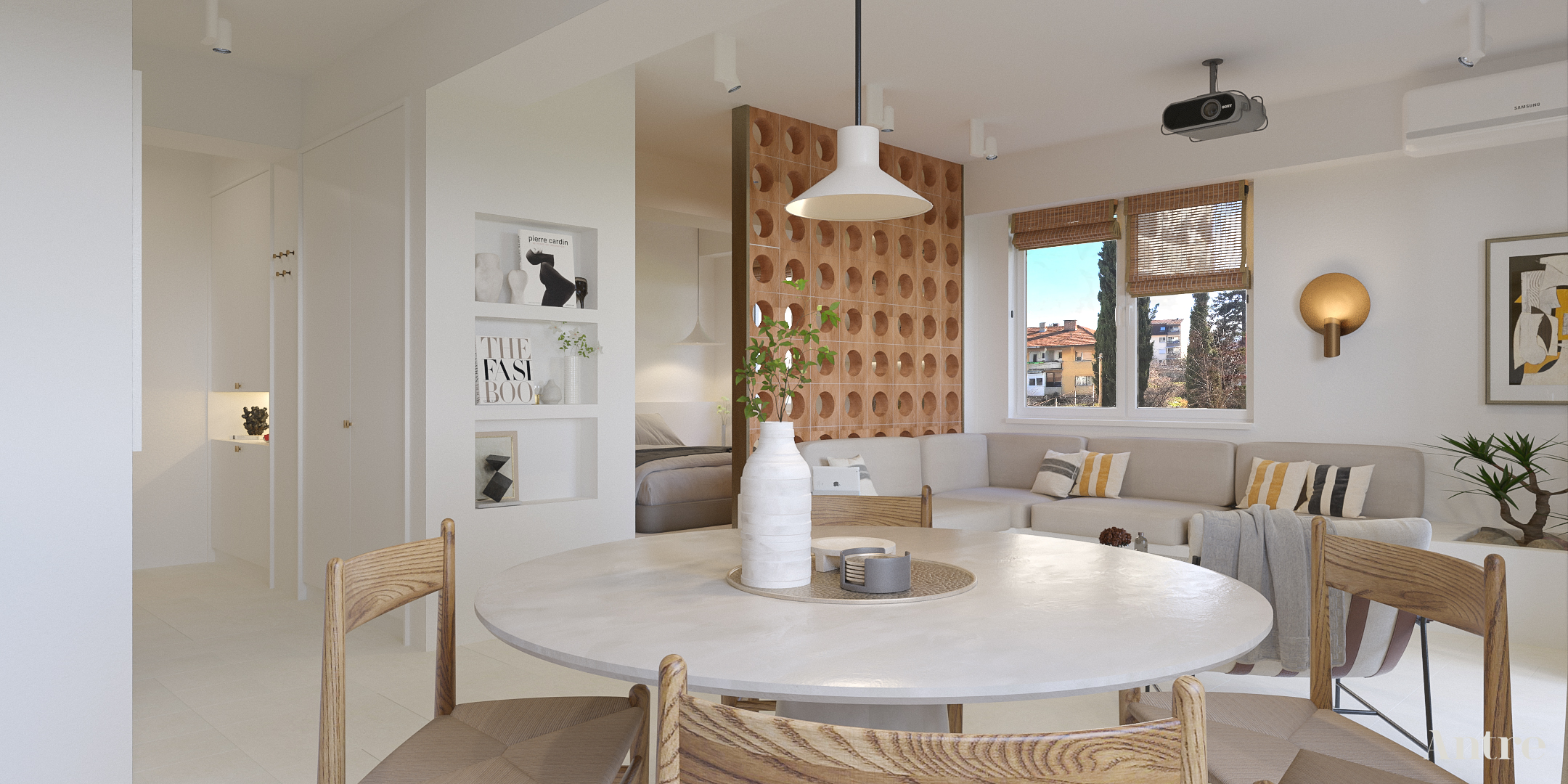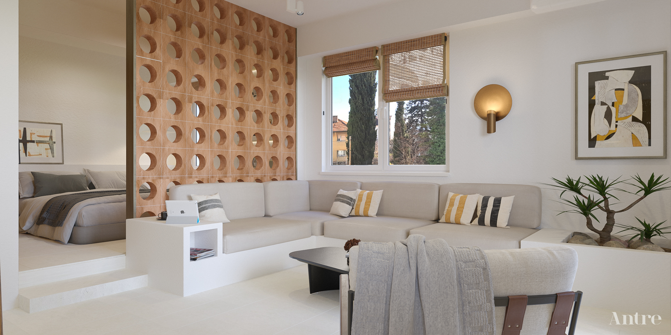 This residential project redefines modern living by blending Mediterranean warmth with clean, minimalist lines. The open-plan layout prioritizes spatial flow, ensuring a seamless transition between the culinary, dining, and relaxation zones. By utilizing a neutral color palette dominated by soft creams and off-whites, the design maximizes natural light entering through expansive windows. The interior architecture is characterized by thoughtful interventions, such as the elevated sleeping dais and the custom terracotta breezeway wall. This unique partition serves as a functional art piece, offering a delicate balance between open-concept transparency and the necessary privacy for the sleeping quarters.